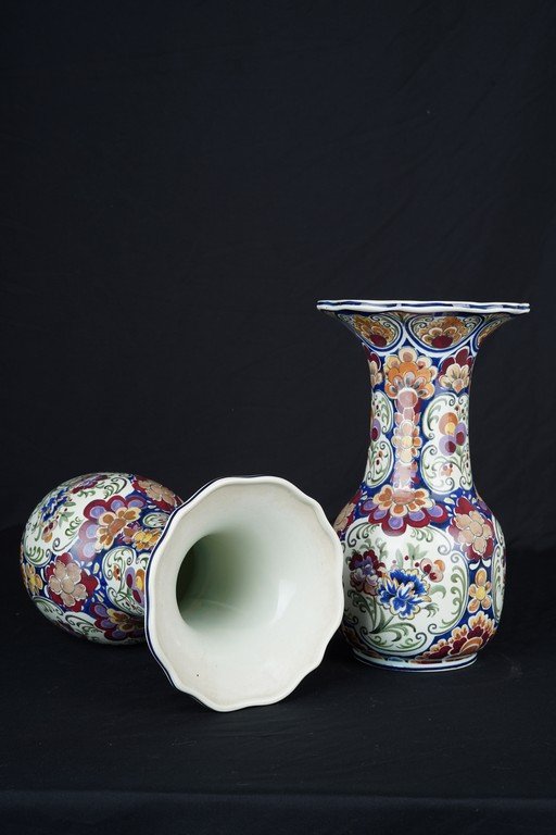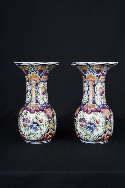 Sepasang vas antik porselen Belgia ini memiliki bentuk klasik dengan mulut lebar melebar keluar, menonjolkan gaya elegan khas Eropa. Permukaan vas dihiasi dekorasi tangan penuh warna dengan motif floral simetris yang rumit, memadukan nuansa merah, biru, kuning, dan hijau di atas dasar putih mengilap. Detail ornamen yang halus mencerminkan kualitas kerajinan porselen Belgia yang tinggi, menghadirkan kesan mewah dan artistik. Koleksi ini bukan hanya wadah dekoratif, tetapi juga karya seni antik bernilai yang merepresentasikan keindahan desain porselen Eropa. Estimasi packing 45*45*45