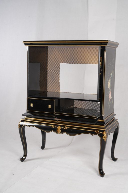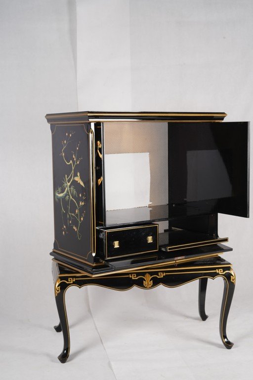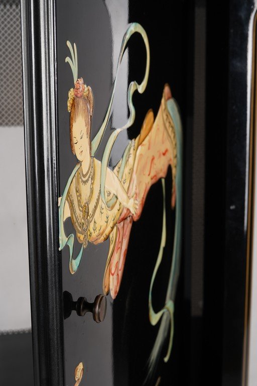 Lemari antik China yang indah dan menawan, menampilkan seni lukis tangan bergaya oriental dengan warna hitam mengilap berpadu aksen emas yang elegan. Motif dewi langit dan pemandangan alam menciptakan nuansa mistis dan penuh keanggunan. Berdiri di atas kaki melengkung bergaya klasik, lemari ini memancarkan keindahan budaya Tiongkok yang halus dan berkelas — sebuah karya antik yang menghadirkan pesona seni dan kemewahan dalam satu tampilan. Estimasi packing 120*70*160