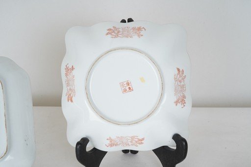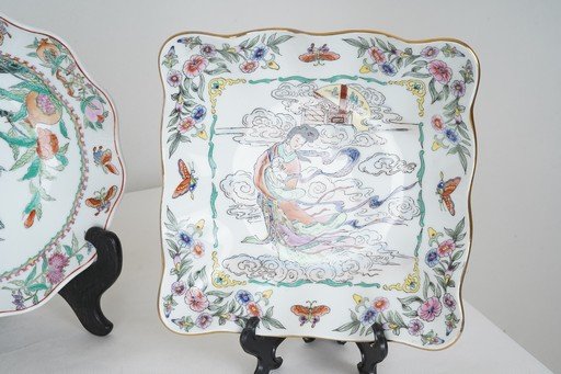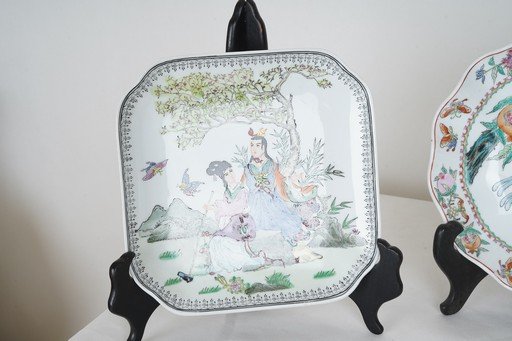 Tiga piring antik dengan bentuk persegi dan tepi bergelombang ini menampilkan dekorasi tangan bergaya tradisional oriental. Setiap piring dihiasi lukisan berwarna lembut menggambarkan adegan figur klasik dan motif burung serta bunga, disertai bingkai hias bermotif flora dan kupu-kupu. Piring-piring ini mencerminkan keindahan seni porselen Cina dengan detail halus dan nuansa warna pastel yang elegan. Cocok sebagai koleksi dekoratif atau pajangan antik bernilai seni tinggi. Estimasi packing 35*35*35