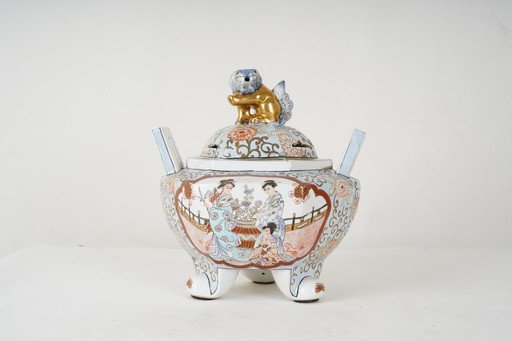 Pot antik bergaya Tiongkok ini terbuat dari porselen dengan dekorasi tangan yang kaya warna dan detail, menampilkan adegan kehidupan istana klasik. Berdiri di atas tiga kaki, pot ini dilengkapi tutup dengan ornamen singa penjaga (fu lion) berwarna emas dan biru di bagian atas. Sentuhan emas dan motif awan serta bunga menambah keanggunan dan nilai artistiknya. Koleksi unik ini merupakan contoh kerajinan porselen tradisional yang elegan, tersedia di Old Amsterdam Antiques. Estimasi packing: 45*45*45