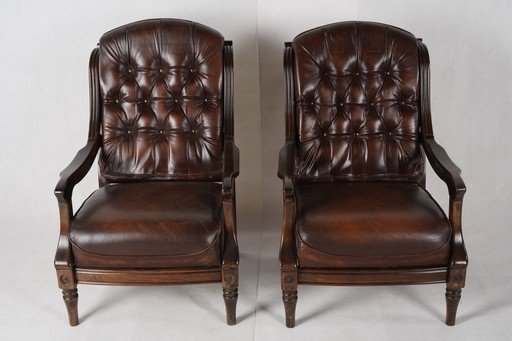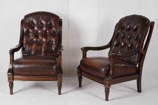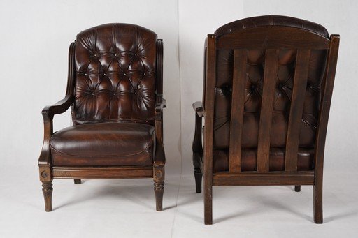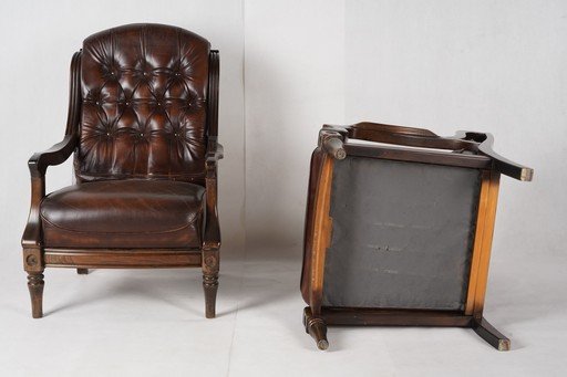 Kursi antik bergaya Dutch Grandfather dengan desain kokoh dan elegan. Rangka terbuat dari kayu solid berukir halus, dipadukan dengan sandaran tinggi berbentuk melengkung. Sandaran dan dudukan dilapisi kulit cokelat tua dengan detail kancing (button tufted) pada bagian belakang yang memberikan kesan mewah dan klasik. Sandaran tangan kayu berpadu harmonis dengan kaki depan berornamen ukiran sederhana. Kursi ini mencerminkan kenyamanan dan kemegahan furnitur Belanda tradisional, ideal sebagai koleksi antik maupun pelengkap interior klasik. Estimasi packing 80*160*100