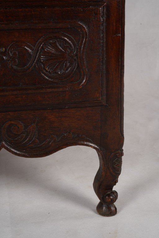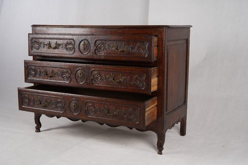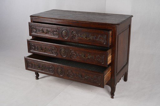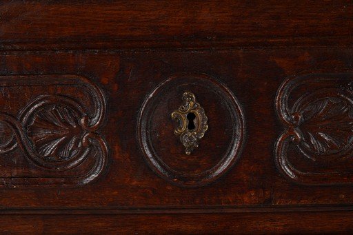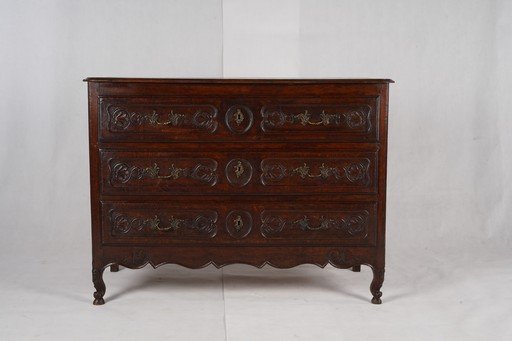 English chest of drawers antik ini merupakan furnitur kayu solid dengan nuansa klasik yang elegan. Terbuat dari kayu ek tua dengan warna cokelat gelap alami, lemari ini memiliki tiga laci besar yang dilengkapi ukiran dekoratif bergaya tradisional Inggris. Setiap laci dihiasi detail pahatan simetris serta pegangan logam kuningan dengan desain khas. Konstruksinya kokoh dengan sisi panel datar dan kaki pendek berlekuk sederhana, menampilkan karakter rustic namun tetap anggun. Furnitur ini tidak hanya berfungsi sebagai tempat penyimpanan yang praktis, tetapi juga menghadirkan nuansa sejarah dan kehangatan antik ke dalam ruangan. Estimasi packing 130*65*100