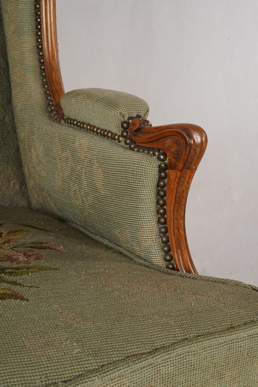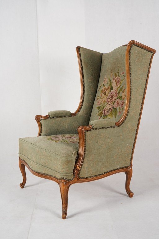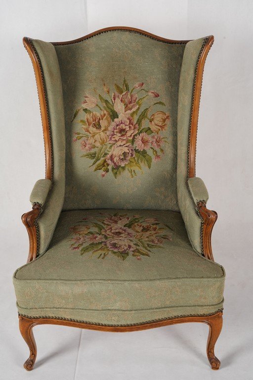 Kursi bergaya klasik dengan desain megah dan elegan dari Old Amsterdam Antiques. Rangka terbuat dari kayu solid berfinishing hangat dengan ukiran halus pada bagian kaki cabriole serta lengkungan tangan yang anggun. Sandaran tinggi berbentuk sayap (wingback) memberikan kesan kokoh sekaligus kenyamanan, khas kursi Inggris tradisional. Upholstery kain hijau tua dihiasi sulaman tangan bermotif buket bunga berwarna lembut, menambah sentuhan artistik sekaligus romantis. Detail paku hias di sekeliling bingkai mempertegas kualitas pengerjaan tangan. Kursi ini bukan hanya furnitur fungsional, tetapi juga sebuah karya antik penuh karakter yang merefleksikan kemewahan dan keanggunan era klasik Inggris. Estimasi packing 75*80*115