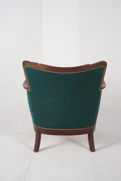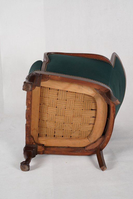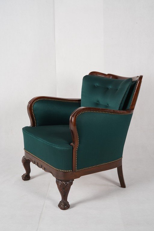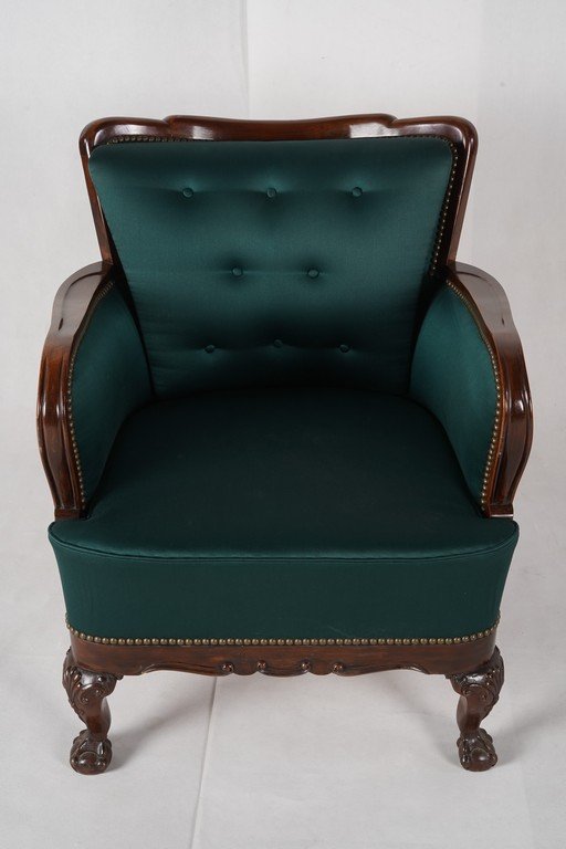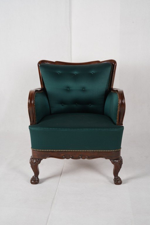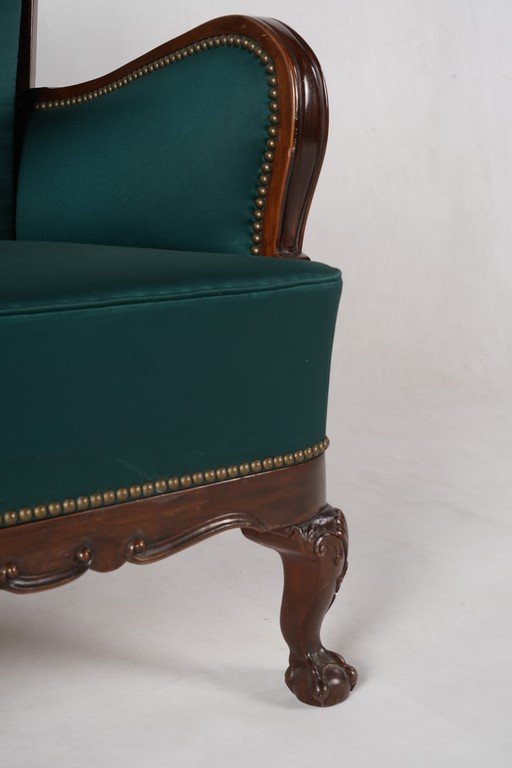 Koleksi English Grandfather Chair ini merupakan contoh elegan dari furnitur klasik Inggris yang memadukan kenyamanan dan keanggunan. Dibuat dengan rangka kayu kokoh yang dipahat halus, kursi ini dilengkapi dengan sandaran punggung agak tinggi serta sandaran lengan di kedua sisi, memberikan kesan megah sekaligus kenyamanan ekstra. Bagian dudukan dan sandarannya serta kedua sisi dilapisi kain berwarna hijau mengkilap yang menonjolkan nuansa mewah, sekaligus mempertegas karakter antik yang anggun. Keaslian detail pada rangka kayu serta kilau kain upholstery menjadikan kursi ini tidak hanya sebagai tempat duduk, tetapi juga sebagai perabot dekoratif bernilai seni tinggi yang memperkaya suasana interior klasik maupun koleksi antik eksklusif. Estimasi packing 90*75*87