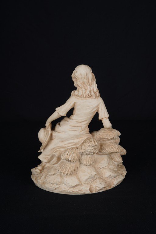 Dekorasi antik French bisque ini menampilkan sosok seorang gadis muda dengan gaya pastoral, duduk anggun di samping tumpukan jerami sambil berinteraksi dengan dua ekor angsa di kakinya. Patung dibuat dari porselen bisque tanpa glasir, memberikan tekstur matte lembut yang menonjolkan detail halus pada rambut, lipatan gaun, dan ekspresi wajah. Nuansa krem pucat dengan efek patina menambah kesan antik dan elegan. Karya ini mencerminkan estetika romantis Prancis, menjadikannya hiasan dekoratif yang bernilai seni tinggi. Estimasi packing 30*30*35