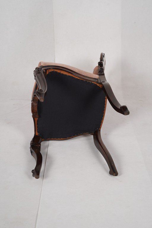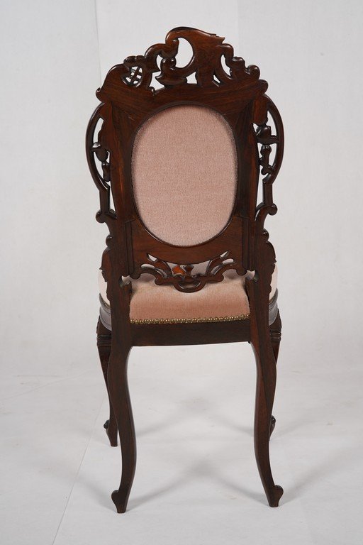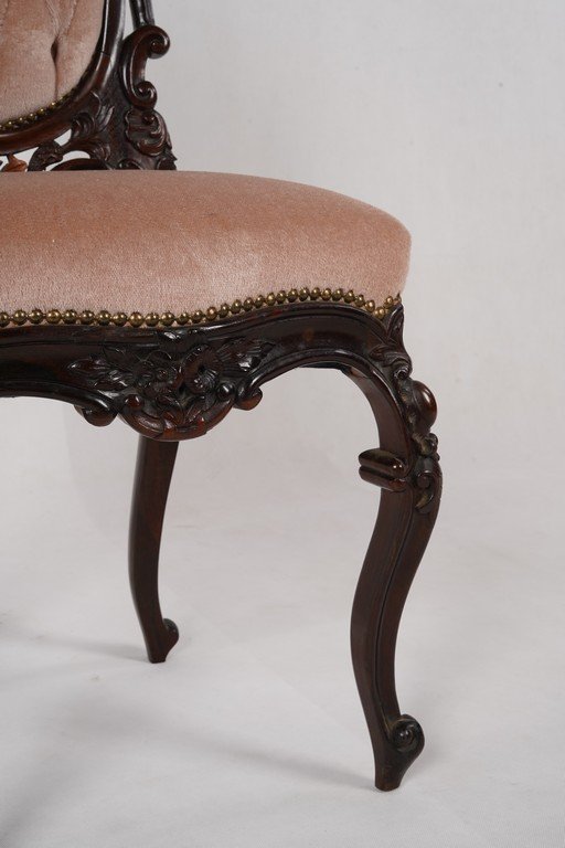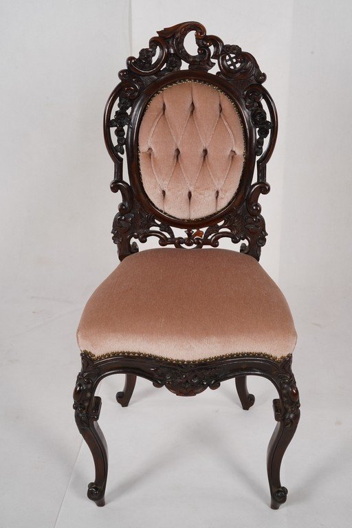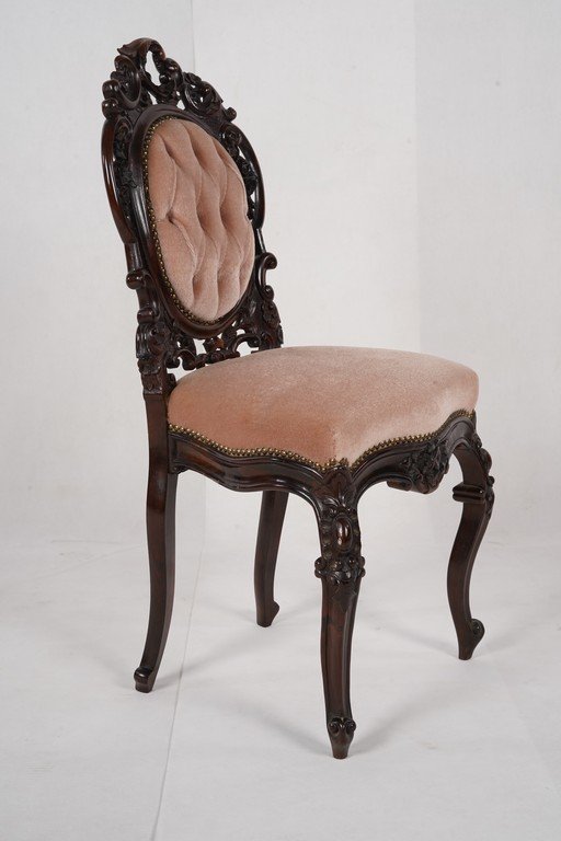 Sebuah karya seni mebel klasik yang menampilkan keanggunan khas Perancis dengan sentuhan ukiran tangan yang halus dan penuh detail terbuat dari kayu solid pilihan dihiasi dengan ornamen ukiran floral, daun acanthus, atau motif rococo yang mencerminkan keanggunan masa lalu. Sandaran punggung dan kaki kursi umumnya berbentuk melengkung indah dengan proporsi anggun, sering dipadukan dengan jok berlapis kain tapestry, brokat, atau kulit berkualitas. Keistimewaannya terletak pada detail ukiran yang memperlihatkan keterampilan tinggi pengrajin Perancis masa itu, menjadikan kursi ini bukan hanya perabot, tetapi juga simbol status, keanggunan, dan kemewahan. Estimasi packing 50*50*100