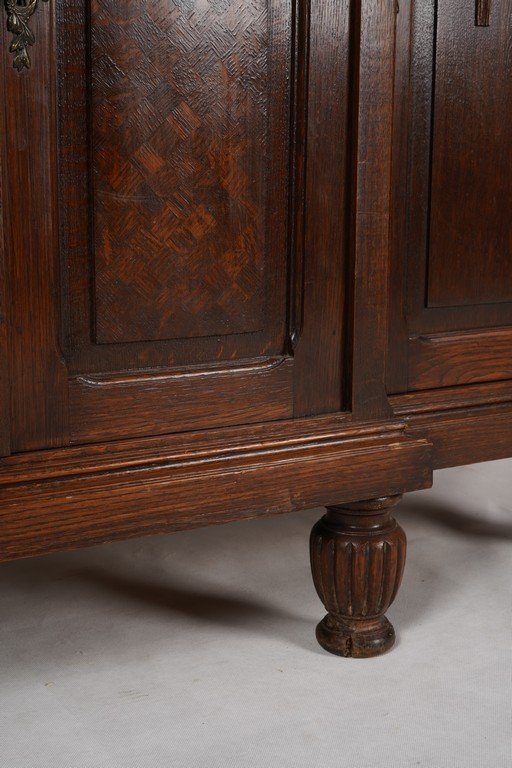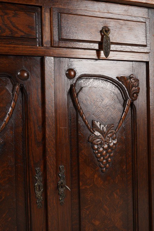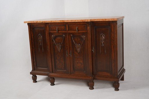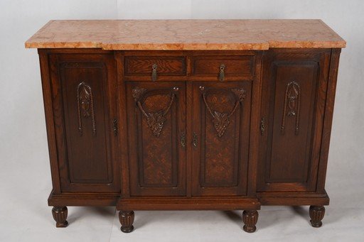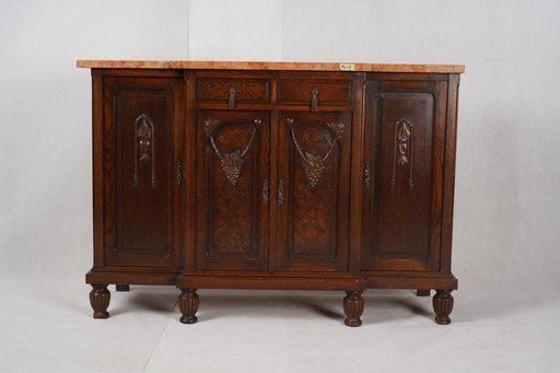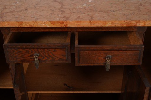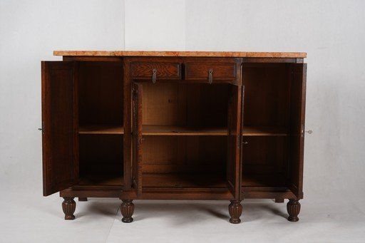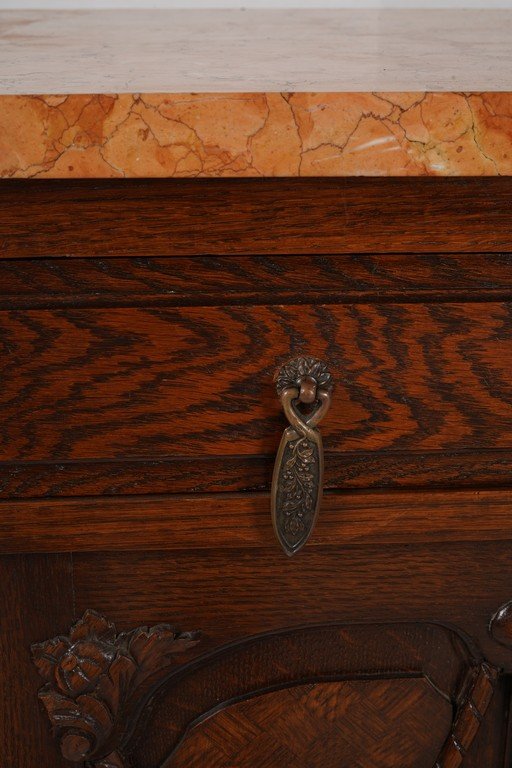 French dresser with marble top koleksi dari toko Old Amsterdam Antiques yang elegan dan berkelas terbuat dari kayu solid dengan ukiran detail bergaya klasik khas Prancis, bagian depan dihiasi panel ukir dekoratif dengan motif simetris yang menambah kesan artistik. Dilengkapi dengan dua pintu samping dan dua pintu tengah serta sebuah laci di bagian atas, dresser ini tidak hanya indah tetapi juga fungsional sebagai tempat penyimpanan. Bagian atasnya menggunakan marmer berwarna lembut dengan urat alami, memberikan kontras mewah pada keseluruhan desain kayu yang hangat. Kaki-kaki berbentuk baluster pendek menambah keseimbangan proporsional pada tampilannya. Estimasi packing 160*65*115