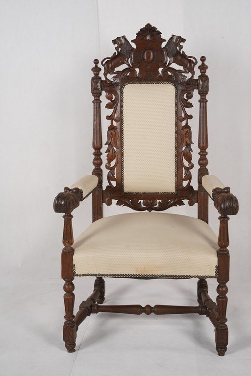 Kursi antik bergaya Perancis yang kokoh dan berkarakter dibuat dari kayu solid oak menonjol dengan konstruksi yang kuat dan sandaran tinggi, dirancang untuk kenyamanan setelah berburu. Ciri khasnya terletak pada ukiran tangan bertema alam seperti kepala rusa, dedaunan oak, atau motif hewan buruan yang menghiasi sandaran dan bagian rangka kayu. Lengan kursi lebar dan kokoh, sementara dudukan serta sandarannya biasanya dilapisi dengan kulit atau tapestry tebal, memberikan kesan maskulin, rustic, namun tetap elegan. Kursi ini tidak hanya berfungsi sebagai tempat duduk, tetapi juga sebagai simbol status sosial kaum bangsawan dan pecinta berburu pada masa itu. Keanggunan ukiran serta kekuatan strukturnya menjadikannya sebuah karya antik bernilai tinggi, ideal untuk kolektor maupun dekorasi interior klasik dengan nuansa aristokrat. Estimasi packing 70*60*130