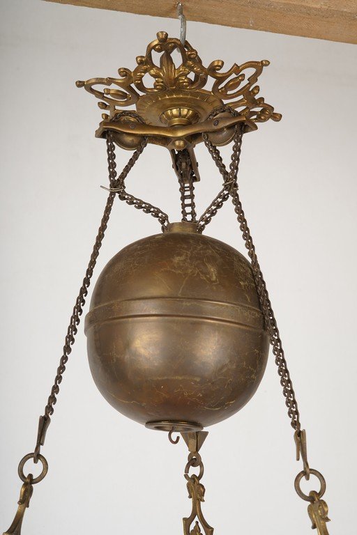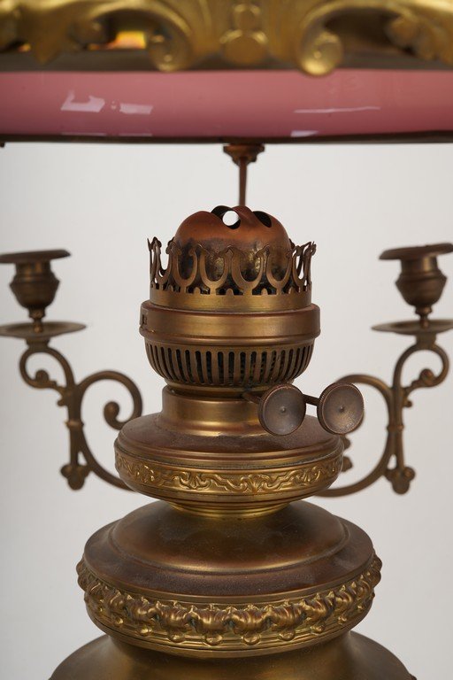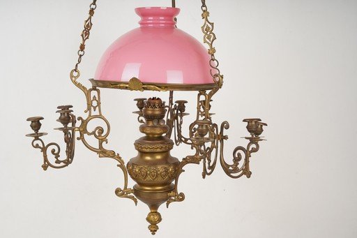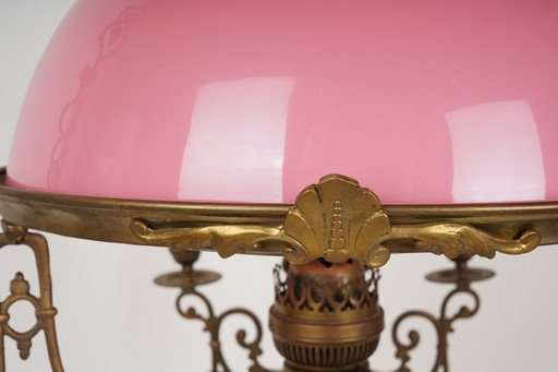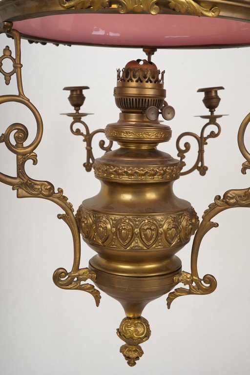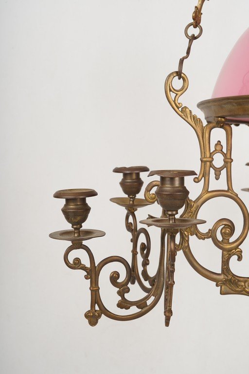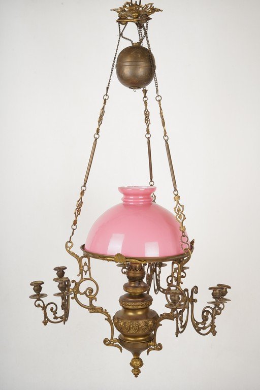 Lampu minyak antik bergaya Prancis dengan gantungan rantai dan ornamen kuningan berukir rumit, dilengkapi kap kaca berwarna merah muda, memadukan fungsi penerangan dan keindahan dekoratif era klasik. Estimasi packing: 100*100*100