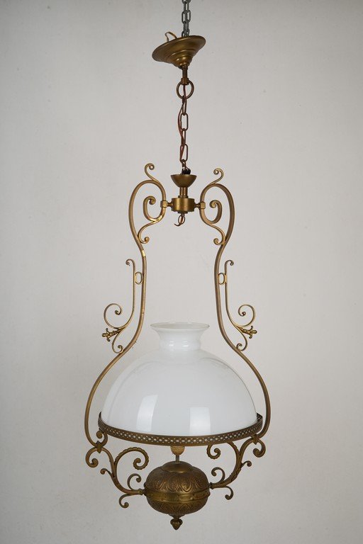Lampu minyak antik bergaya Prancis dengan gantungan rantai dan ornamen kuningan berukir rumit, dilengkapi kap kaca berwarna hijau muda, memadukan fungsi penerangan dan keindahan dekoratif era klasik. Estimasi packing: 100*100*100