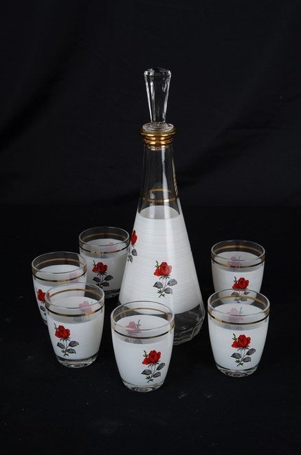 Set antik berisi satu botol decanter kaca dan enam gelas minum, dihiasi motif bunga mawar merah yang indah. Bagian atas botol memiliki tutup kaca berbentuk kerucut panjang, sedangkan tepi botol dan gelas dilapisi garis emas yang menambah kesan mewah. Desain floral klasik dan aksen emas ini mencerminkan gaya vintage yang elegan, cocok sebagai koleksi maupun pajangan dekoratif. Estimasi packing: 45*45*45
