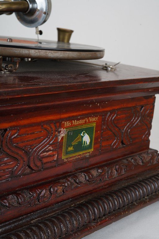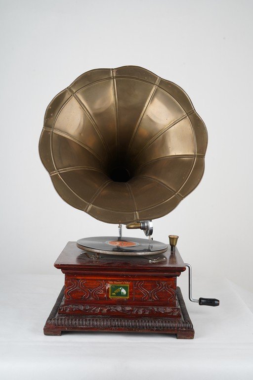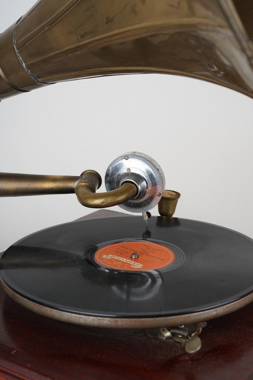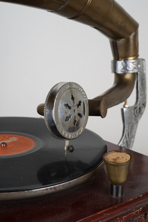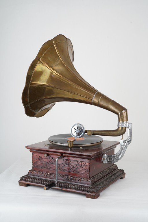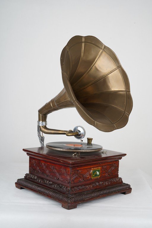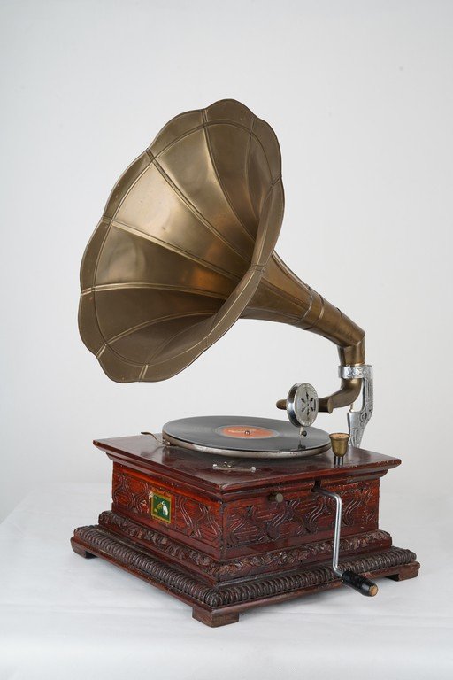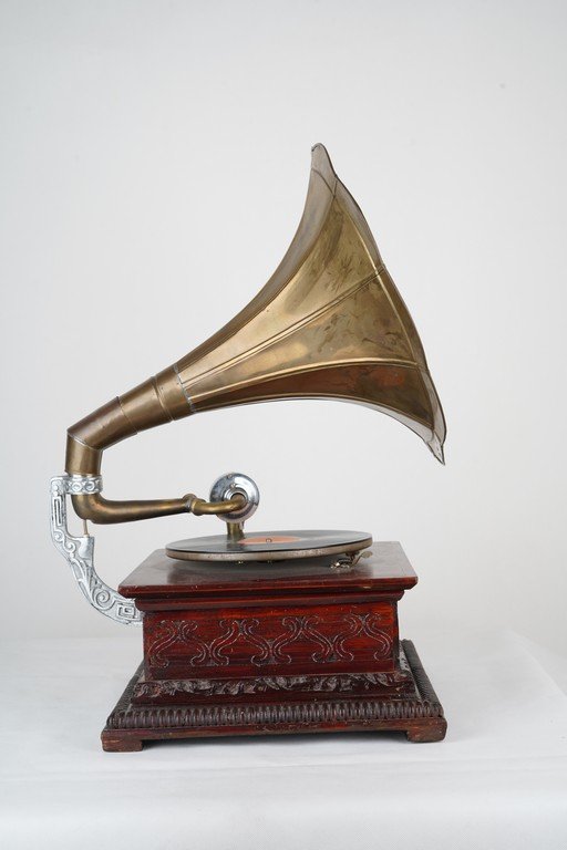 Gramofon antik dengan desain klasik awal abad ke-20, terdiri dari kotak kayu berukir indah sebagai alas pemutar piringan hitam dan corong besar dari logam berwarna perunggu. Kotak kayu dibuat dari material berkualitas dengan ukiran motif floral dan geometris yang menonjolkan keterampilan pengrajin pada masanya. Corong berbentuk bunga *morning glory* menjadi elemen ikonik, memancarkan suara dengan karakter hangat khas gramofon mekanis. Bagian pemutar piringan hitam masih terlihat lengkap dengan lengan nada (*tonearm*) serta jarum pemutar. Warna kayu gelap berpadu harmonis dengan kilau logam corong, menciptakan kesan elegan dan mewah. Gramofon ini tidak hanya sebagai alat musik bersejarah, tetapi juga koleksi dekoratif bernilai tinggi yang merepresentasikan perkembangan teknologi audio dan seni desain pada masa lampau. Estimasi packing 55*55*60