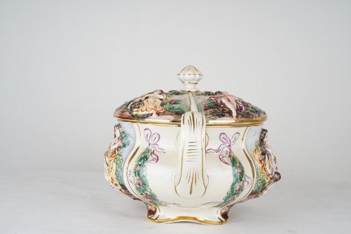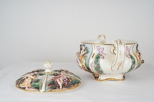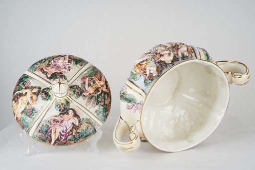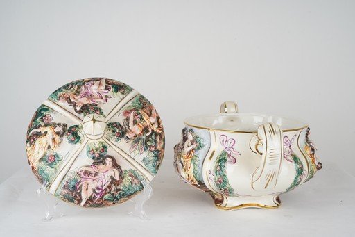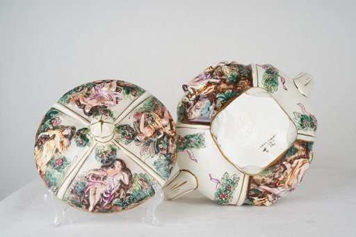 Mangkok antik Italian Porcelain Bowl ini menampilkan keindahan kerajinan porselen Italia dengan detail halus dan elegan. Terbuat dari porselen berkualitas tinggi berwarna putih gading, bagian permukaannya dihiasi dekorasi bergaya klasik dengan sentuhan warna emas dan aksen warna lembut yang menambah kesan mewah. Bentuk mangkok proporsional dengan lekukan anggun pada bibirnya, memberikan tampilan halus dan artistik. Karya porselen ini tidak hanya berfungsi sebagai wadah, tetapi juga sebagai elemen dekoratif yang mencerminkan cita rasa seni Italia yang penuh keanggunan dan kehalusan. Cocok sebagai koleksi maupun pajangan bernilai seni tinggi. Estimasi packing 45*45*45