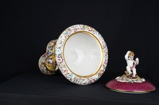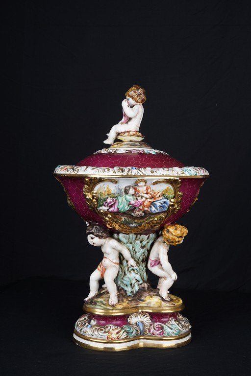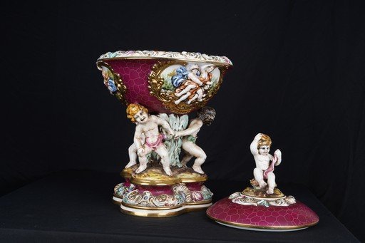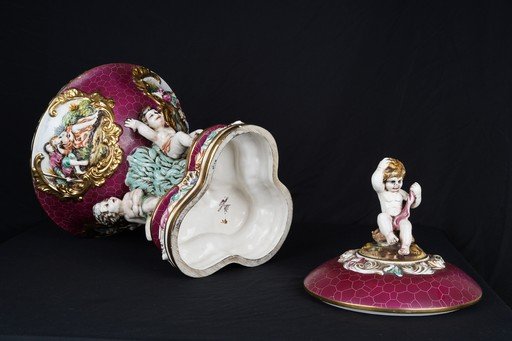 Dekorasi porselen antik bergaya Rococo Eropa dengan desain megah dan penuh detail berbentuk mangkuk besar berwarna dasar merah marun dengan motif sarang lebah, dihiasi panel lukisan adegan romantis pastoral yang dikelilingi ornamen emas. Tutupnya menampilkan figur cherub kecil duduk di puncak, menambah kesan artistik. Bagian bawah ditopang oleh tiga figur anak kecil (putti) yang berdiri di atas alas berornamen kerang dan dedaunan berwarna-warni. Kombinasi ukiran, warna emas, dan lukisan tangan menjadikan porselen ini karya dekoratif mewah yang mencerminkan keanggunan seni antik Eropa pada masa lalu. Estimasi packing 45*45*50