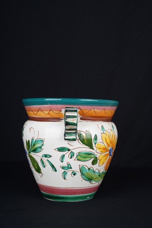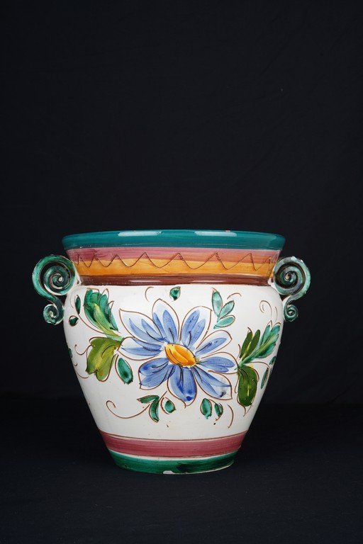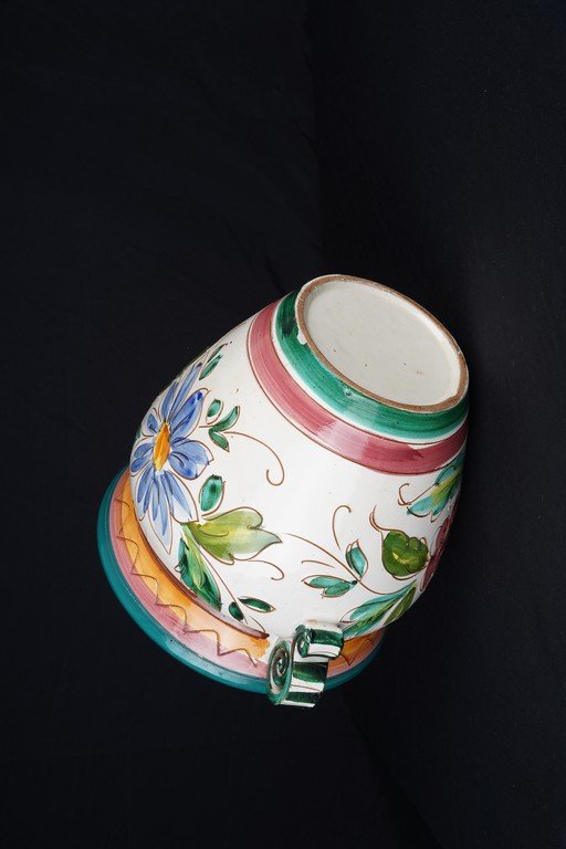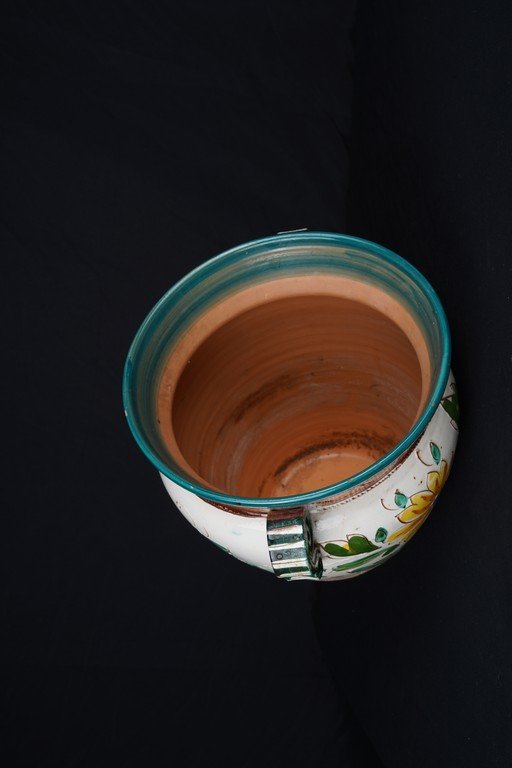 Pot bunga antik porselen dari Italia yang dihiasi lukisan tangan bermotif bunga besar berwarna biru dengan putik kuning, dikelilingi dedaunan hijau dan ornamen garis lengkung. Pinggiran atas berwarna hijau toska dengan aksen merah bata dan kuning keemasan yang menambah karakter dekoratifnya. Nuansa cerah dan detail floral khas kerajinan porselen Italia, menjadikannya koleksi antik yang indah sekaligus fungsional sebagai wadah bunga atau dekorasi interior. Estimasi packing 35*35*40
