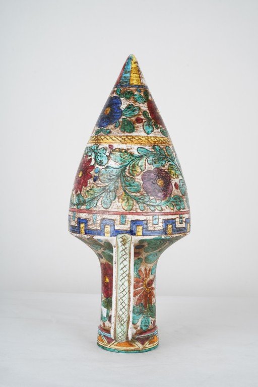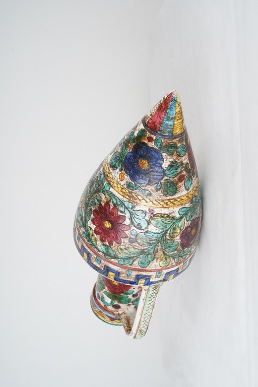 Vas antik porselen dari Italia dengan bentuk elegan meruncing dengan dua pegangan kanan dan kiri, menampilkan gaya dekoratif khas kerajinan Italia. Permukaannya dihiasi lukisan tangan dengan motif floral berwarna cerah—kombinasi, yang memberikan kesan hidup dan artistik. Teknik pewarnaan dan dekorasi yang mencolok mencerminkan keahlian pengrajin Italia masa lampau, menjadikan vas ini tidak hanya berfungsi sebagai dekorasi, tetapi juga sebagai karya seni dekoratif bernilai tinggi. Cocok dijadikan koleksi antik maupun elemen interior klasik yang berkarakter. Estimasi packing 35*35*60