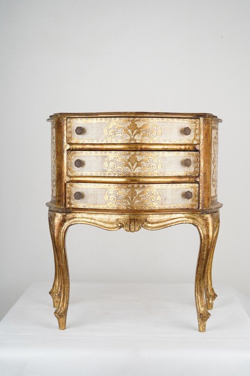 Lemari kecil antik ini menampilkan keindahan furnitur bergaya Italia dengan sentuhan elegan dan dekoratif. Terbuat dari kayu dengan finishing warna emas dan putih antik, permukaannya dihiasi motif floral dan ornamen ukiran yang kaya akan detail artistik. Bagian depan terdiri dari tiga laci dengan bentuk bergelombang (serpentine front) yang memberikan kesan dinamis dan mewah. Lacinya dilengkapi knop kecil sederhana yang kontras dengan keindahan ukirannya. Kaki bergaya cabriole ramping mempertegas nuansa klasik serta menambah kesan ringan pada keseluruhan desain. Dresser mungil ini sangat ideal sebagai elemen dekorasi sekaligus tempat penyimpanan kecil, menghadirkan pesona khas Italia yang anggun dan penuh seni. Estimasi packing 70*45*75