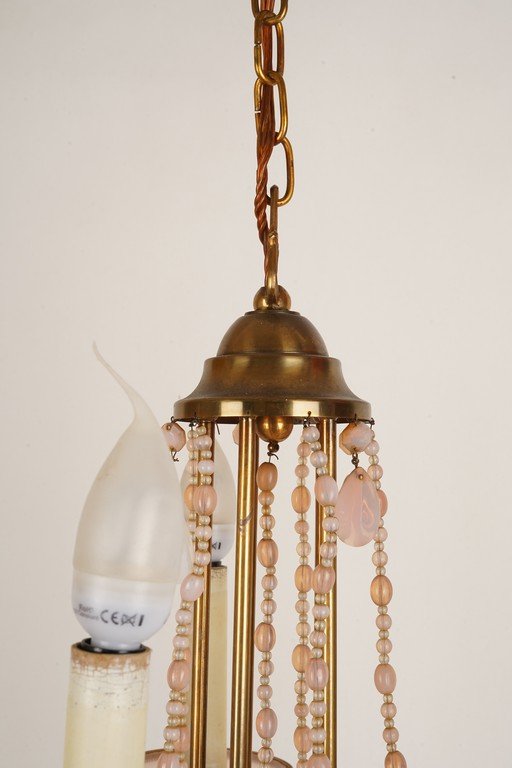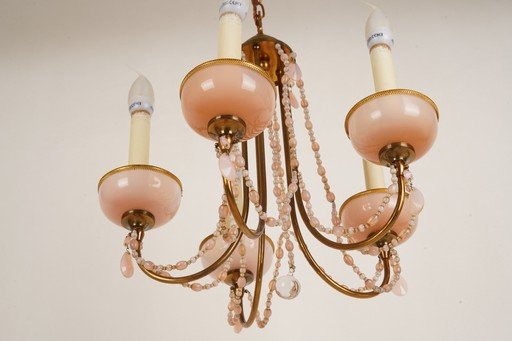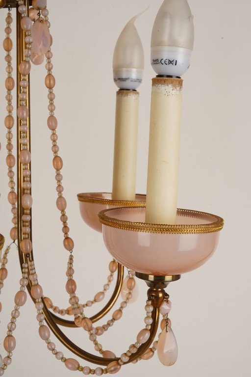 Lampu gantung antik **Opaline Hall Lamp** ini menampilkan desain elegan dengan rangka berbahan logam tua. Setiap lengan dihiasi mangkuk kaca opaline berwarna merah muda lembut yang berfungsi sebagai dudukan bohlam berbentuk lilin. Rangka lampu dihiasi dengan untai manik-manik kristal dan tetesan kaca opaline yang memperkuat kesan klasik dan mewah. Gaya lampu ini mencerminkan nuansa romantis Eropa pada masa lalu, cocok sebagai dekorasi ruang tamu atau lorong dengan sentuhan antik yang lembut dan anggun. Estimasi packing 55*55*55