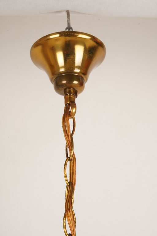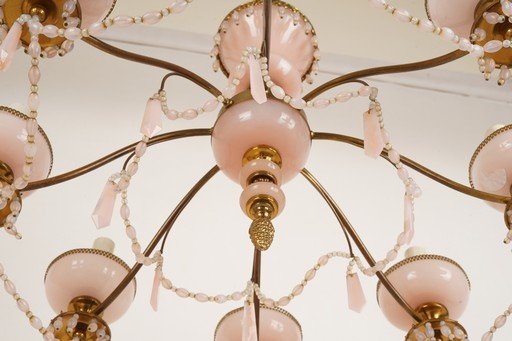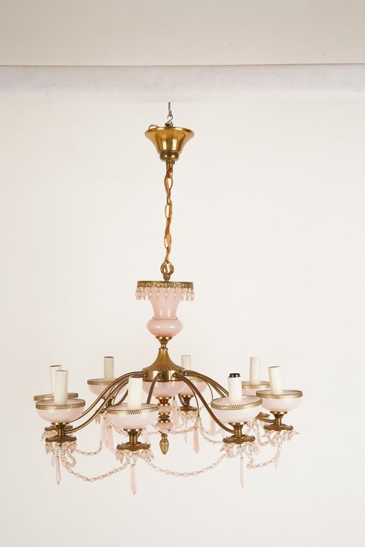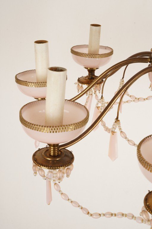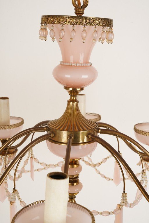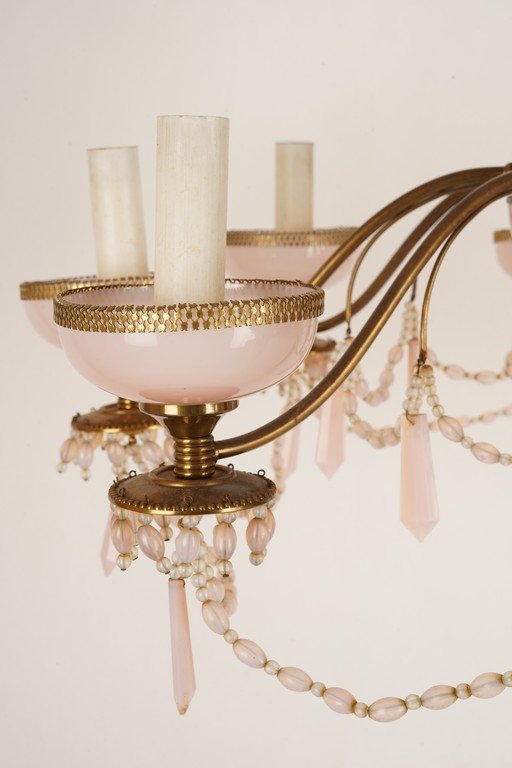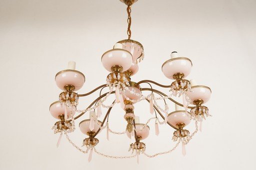 Lampu gantung antik **Opaline Hall Lamp** ini menampilkan desain elegan dengan rangka berbahan logam tua. Setiap lengan dihiasi mangkuk kaca opaline berwarna merah muda lembut yang berfungsi sebagai dudukan bohlam berbentuk lilin. Rangka lampu dihiasi dengan untai manik-manik kristal dan tetesan kaca opaline yang memperkuat kesan klasik dan mewah. Gaya lampu ini mencerminkan nuansa romantis Eropa pada masa lalu, cocok sebagai dekorasi ruang tamu atau lorong dengan sentuhan antik yang lembut dan anggun. Estimasi packing 75*75*60