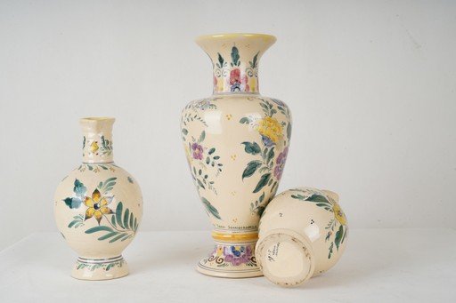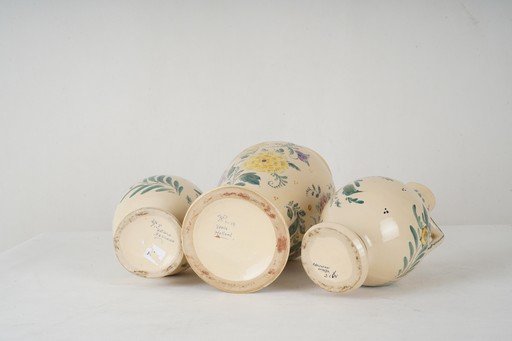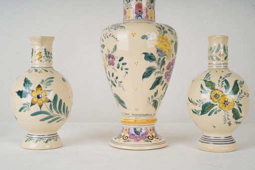 Set barang antik ini terdiri dari tiga vas porselen khas Kasstel dengan nuansa warna krem dan motif bunga berwarna-warni yang dilukis tangan. Gaya dekoratifnya mencerminkan sentuhan seni Eropa klasik, dengan bentuk leher sempit dan badan bulat yang elegan. Cocok sebagai pajangan dekoratif yang menambah kesan anggun dan bersejarah pada interior rumah atau koleksi antik bergaya vintage. Estimasi packing: 50*50*50