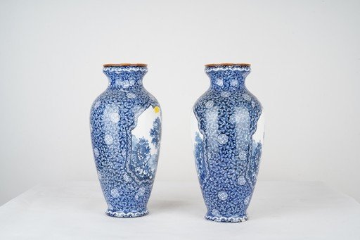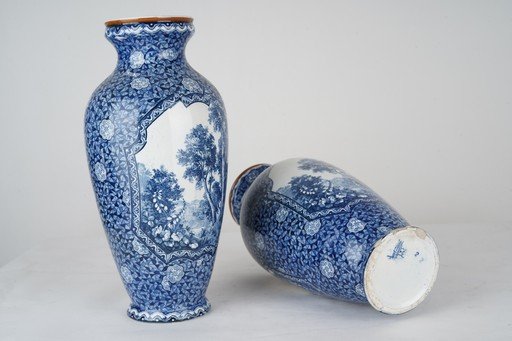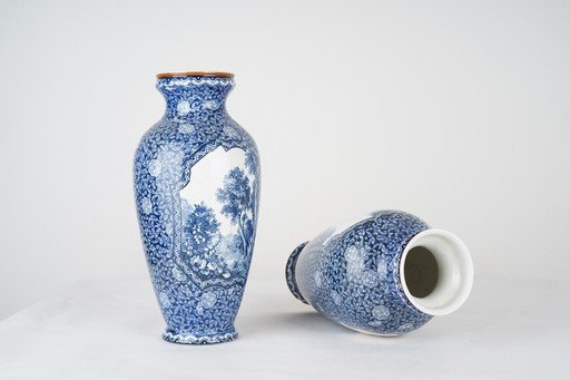 Sepasang porcelain vase antik ini menampilkan desain elegan khas Eropa dengan dominasi warna biru dan putih. Permukaannya dihiasi motif bunga halus dan pemandangan alam bergaya klasik yang digambar tangan dengan detail halus. Bentuk vas ramping dengan leher menyempit dan mulut melebar, memberikan kesan anggun dan seimbang. Finishing glasir mengilap menambah kilau porselen berkualitas tinggi, menjadikannya koleksi dekoratif yang bernilai seni dan sejarah tinggi. Estimasi packing 45*45*45