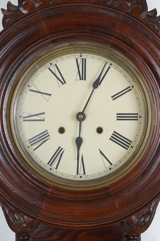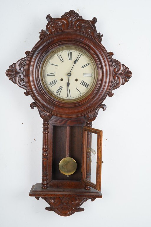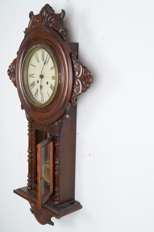 Jam dinding antik yang bergaya klasik Eropa, terbuat dari kayu solid dengan ukiran ornamen indah di bagian atas dan bawah. Memiliki dial bulat berangka Romawi berwarna krem serta bandul kuningan di balik kaca bertuliskan “REGULATOR A”. Desain tiang kayu di sisi kanan-kiri menambah kesan elegan dan mewah. Estimasi packing 70*20*110