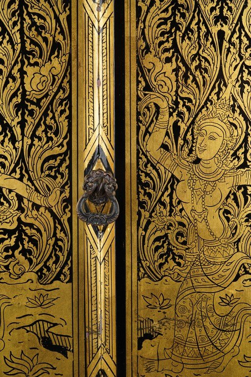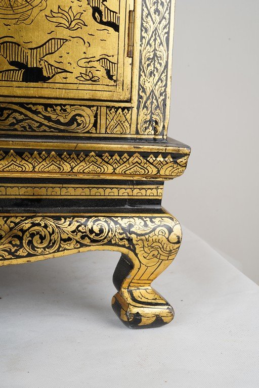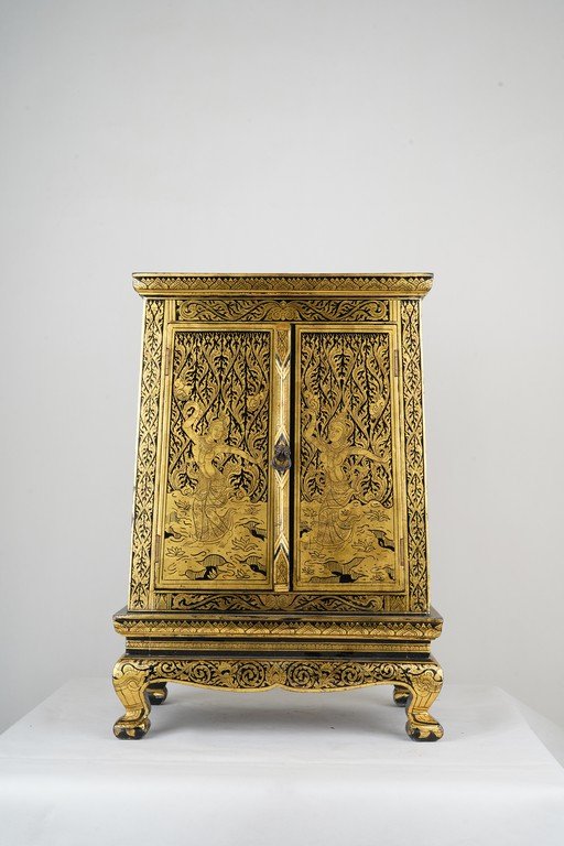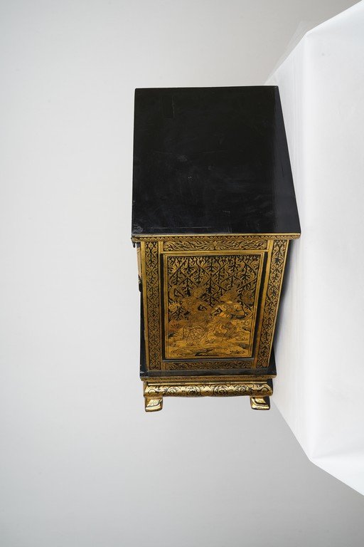 Kabinet antik Tiongkok bergaya tradisional dengan dua pintu, dibuat dari kayu berkualitas dan dilapisi dengan dekorasi emas yang indah. Seluruh permukaan kabinet dipenuhi ukiran serta lukisan tangan bermotif pemandangan alam, pepohonan, serta figur manusia, khas seni dekoratif Tiongkok. Warna emas mendominasi dengan detail hitam yang menonjolkan kontras elegan. Kabinet berdiri di atas kaki bergaya melengkung dengan hiasan ukiran floral, menambahkan kesan mewah dan artistik. Bentuknya proporsional dengan atap datar sedikit melebar, mencerminkan pengaruh desain klasik masa lampau. Barang ini bukan hanya berfungsi sebagai tempat penyimpanan, tetapi juga sebagai karya seni dekoratif bernilai tinggi yang memperlihatkan keahlian pengrajin Tiongkok kuno. Estimasi packing 60*45*80