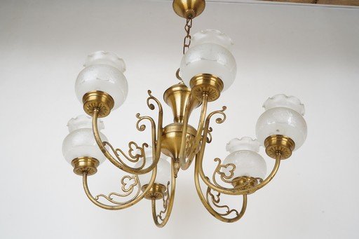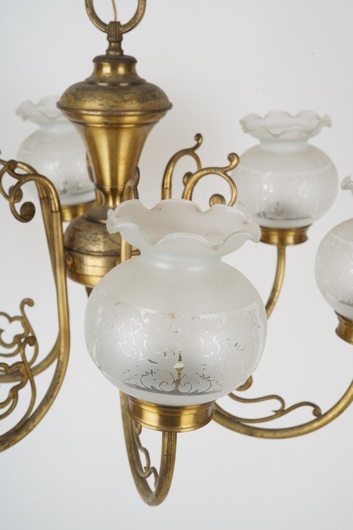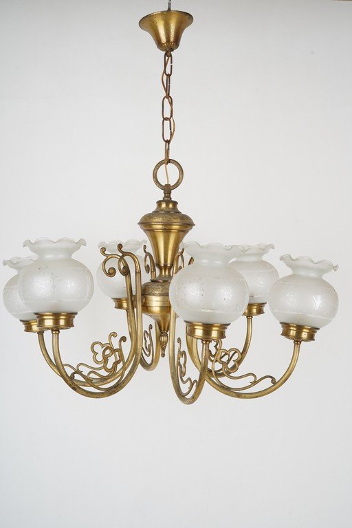 Lampu gantung antik **Spanish Bronze Hall Lamp** ini menampilkan rangka perunggu berkilau dengan enam lengan melengkung elegan bergaya klasik Spanyol. Setiap lengan dihiasi kap kaca buram berbentuk bunga dengan ukiran halus yang memancarkan cahaya lembut dan hangat. Desainnya memadukan kemewahan dan keanggunan, mencerminkan estetika Eropa masa lampau. Lampu ini menjadi pilihan sempurna sebagai pusat penerangan ruang tamu atau lorong bergaya antik. Estimasi packing 75*75*75