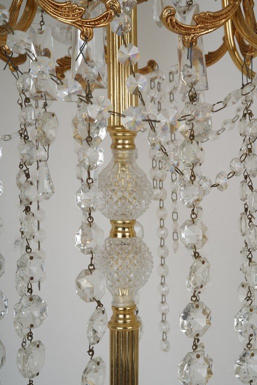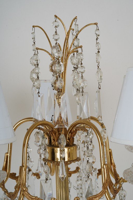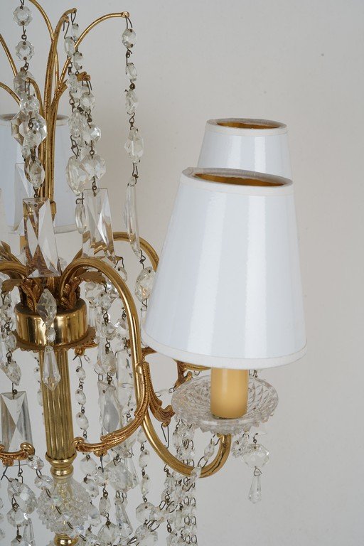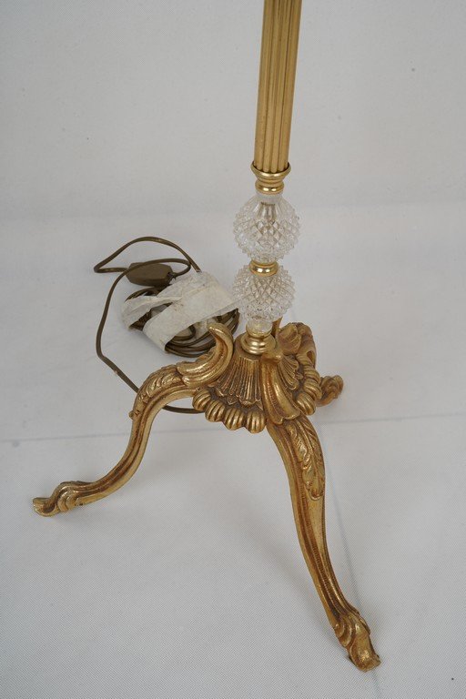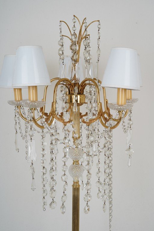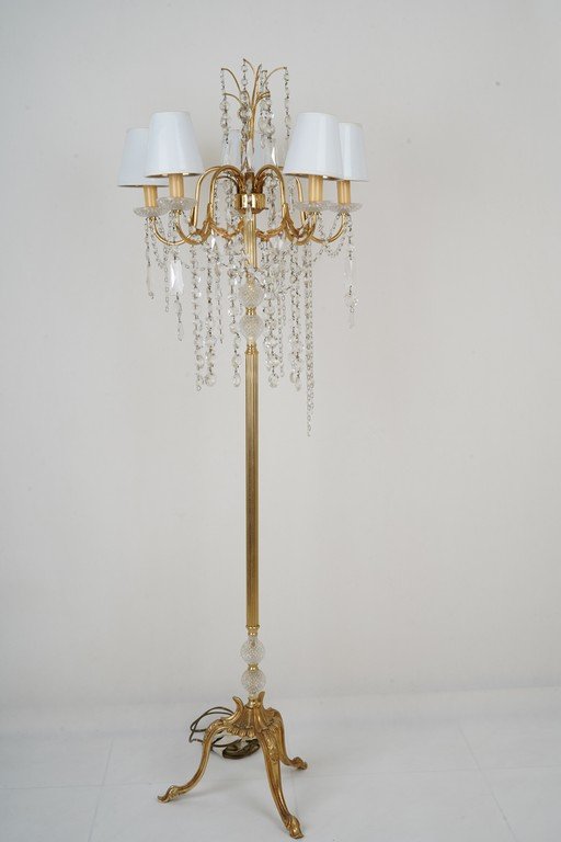 Standing hall lamp antik bergaya klasik dengan rangka logam berlapis emas yang berdiri di atas kaki tripod melengkung elegan. Bagian atas dilengkapi beberapa dudukan lampu dengan kap putih sederhana, dihiasi gantungan kristal menjuntai yang menambah kilau mewah. Tiang utama ramping dengan detail bola kaca dekoratif di bagian tengah, menghadirkan perpaduan kemewahan dan keanggunan. Lampu ini cocok sebagai elemen penerangan sekaligus dekorasi elegan untuk ruang tamu atau hall bergaya klasik. Estimasi packing 60*60*160