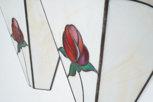 Tiffany applique lamps antik ini merupakan lampu dinding bergaya Art Nouveau dengan kap kaca patri khas desain Tiffany. Setiap potongan kaca disusun membentuk motif bunga dan daun, memancarkan cahaya hangat dan lembut saat dinyalakan. Rangka logamnya memiliki sentuhan ukiran halus dengan lapisan perunggu tua, menambah kesan elegan dan klasik. Lampu ini mencerminkan keindahan seni dekoratif dan menjadi elemen dekorasi yang mewah serta berkarakter. Estimasi packing 45*45*45
