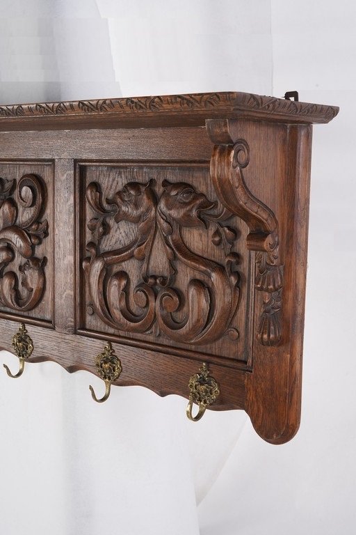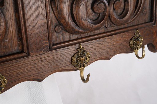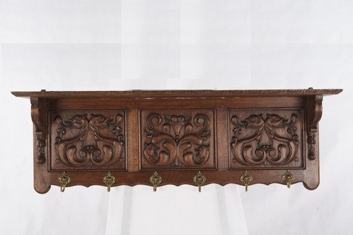 Wooden Coathanger ini adalah sebuah gantungan dinding yang menawan, terbuat dari kayu solid dengan ukiran tangan yang indah. Bagian depannya menampilkan relief motif yang rumit, memberikan sentuhan seni dan karakter klasik khas furnitur Eropa. Dilengkapi dengan beberapa kait logam berwarna emas tua di bagian bawah, gantungan ini berfungsi untuk menyimpan mantel, topi, atau kunci, sekaligus menjadi elemen dekoratif pada dinding. Bentuknya kokoh dengan sisi ukiran melengkung, serta patina alami kayu menambah nuansa antik yang elegan. Barang ini bukan sekadar gantungan, melainkan karya seni dekoratif yang mencerminkan gaya hidup dan keanggunan masa lampau. Estimasi packing: 145*30*55