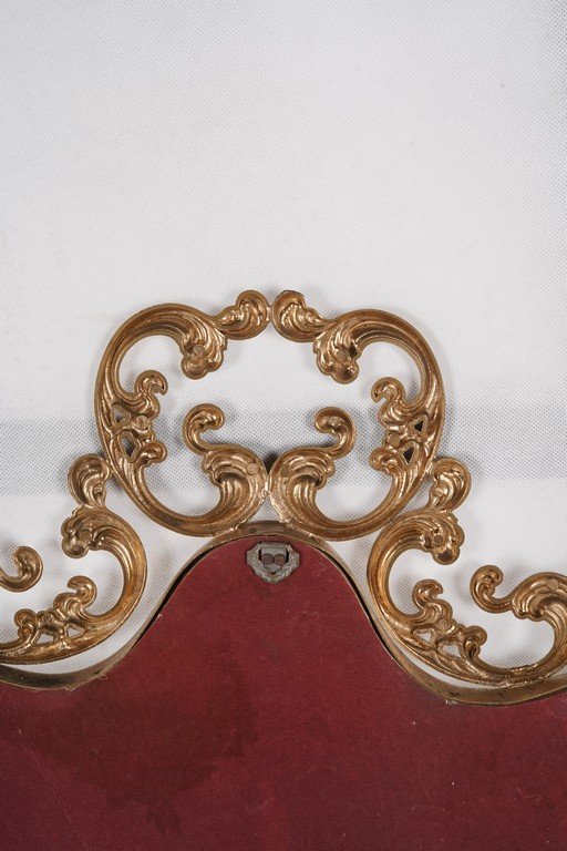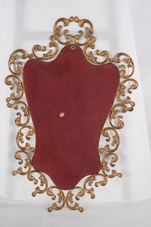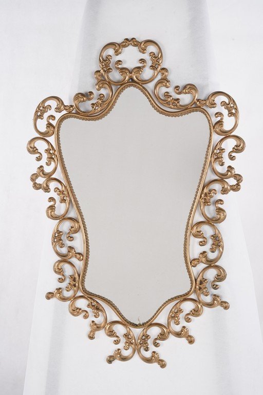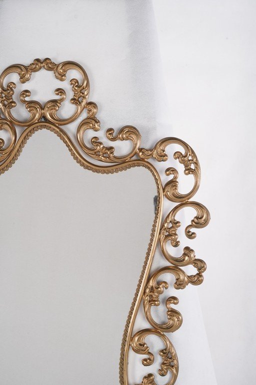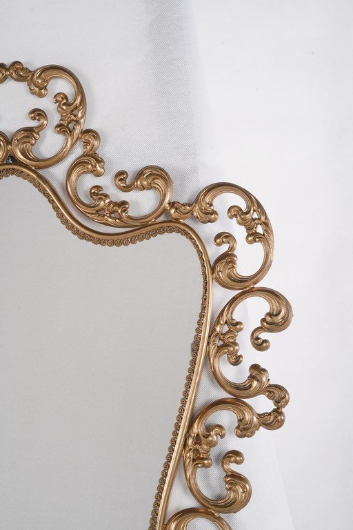 Cermin antik ini memiliki bingkai kayu berlapis warna emas dengan desain penuh ornamen bergaya Rococo. Bingkainya dihiasi ukiran tangan berbentuk gulungan daun acanthus dan motif floral yang berkelok indah, menonjolkan kemewahan dan keanggunan khas Eropa. Bentuk cermin yang unik dengan lekukan elegan memberikan karakter artistik, sementara finishing emas antik menghadirkan nuansa mewah sekaligus klasik. Cermin ini tidak hanya berfungsi sebagai benda fungsional, tetapi juga sebagai dekorasi dinding yang mempercantik ruang tamu, kamar, atau lorong, menghadirkan sentuhan aristokratik yang menawan. Estimasi packing 70*20*95